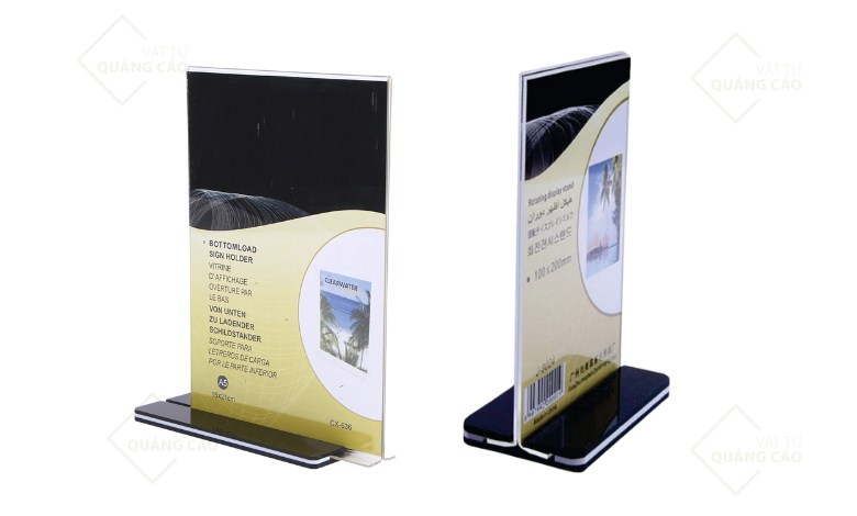 Menu để bàn mica là sản phẩm được làm từ chất liệu mica trong suốt. Sản phẩm mang lại sự bền bỉ và có tính thẩm mỹ cao. Kích thước phổ biến thường dao động từ A5 đến A4, phù hợp để hiển thị thông tin như thực đơn, chương trình khuyến mãi hay hướng dẫn sử dụng. Với thiết kế dạng chữ T, menu mica có thể đứng vững trên bàn. Dễ dàng đặt tại các vị trí khác nhau như quầy lễ tân, bàn ăn, hoặc quầy thanh toán.