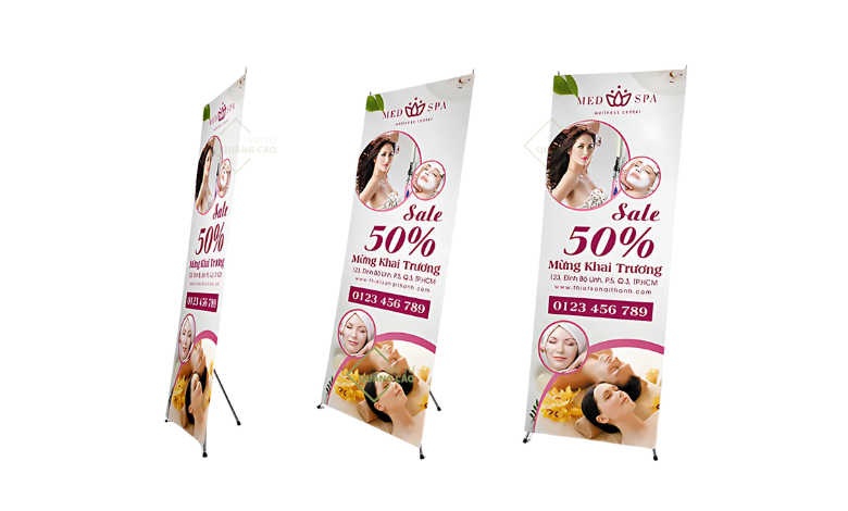 Standee chữ X là sản phẩm quảng cáo phổ biến nhất hiện nay. Chúng thường được doanh nghiệp sử dụng để giới thiệu dịch vụ và sản phẩm. Tên gọi “standee chữ X” xuất phát từ thiết kế của nó, với cấu trúc hình chữ X gọn nhẹ, di động và dễ lắp ráp. Loại standee này thường được làm từ khung sắt phủ sơn tĩnh điện và các nút treo được chế tạo bằng nhựa cứng cao cấp, mang lại độ bền cao. Với kích thước phổ biến như 60x160cm và 80x180cm. Standee chữ X là công cụ tiếp thị hiệu quả, giúp hiển thị thông tin nổi bật tại các sự kiện khai trương lớn một cách tiện lợi. Đặc biệt giá thành của các sản phẩm này vô cùng phải chăng.